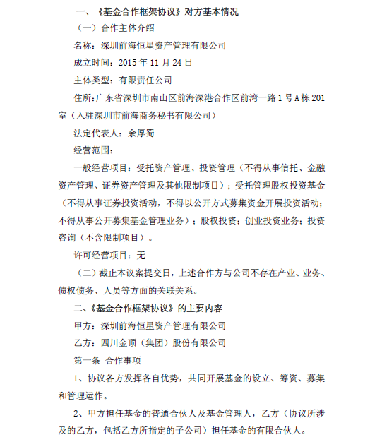 恒星資本與四川金頂(600678)簽署《基金合作框架協議》