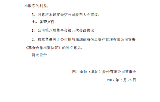 2017年7月24日,四川金頂(600678)于深圳市福田區益田路6009號新世界商務中心47樓會議室以現場結合通訊方式成功召開了第八屆董事會第五次會議,會議審議通過了《關于公司擬與深圳前海恒星資產管理有限公司簽署〈基金合作框架協議〉的議案,四川金頂將與前海恒星攜手共同組建并購基金,圍繞四川金頂發展戰略及業務布局展開投資。本次議案已提交2017年第二次臨時股東大會審議,并將于2017年8月11日進行召開。