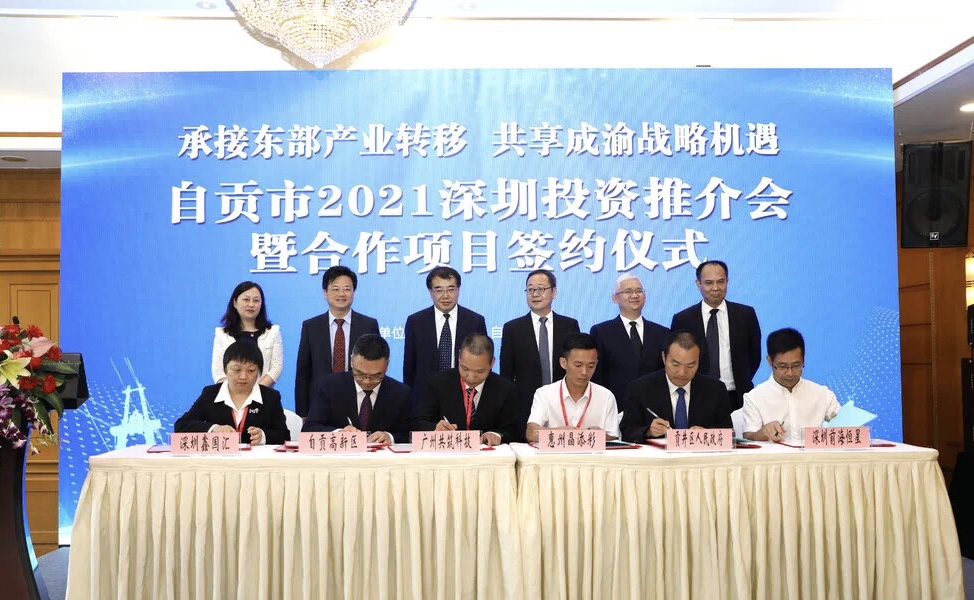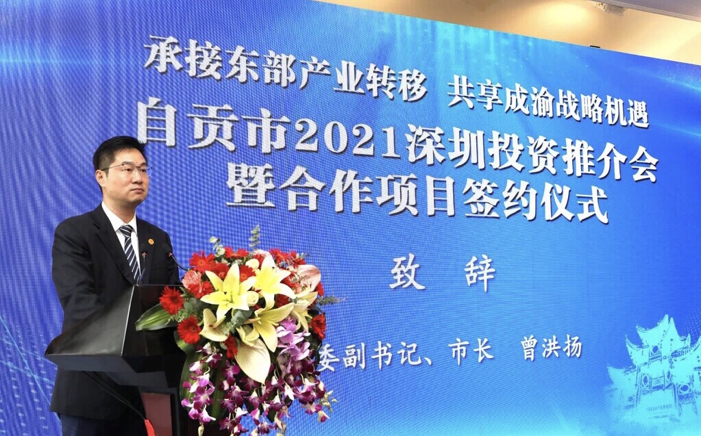 5月18日下午,“承接東部產業轉移·共享成渝戰略機遇”——自貢市2021深圳投資推介會暨合作項目簽約儀式正式舉行, 100余位國內外知名企業、有關商協會負責人相聚深圳,共享新機遇,共建新格局。四川省人民政府駐廣州辦事處主任王德勝出席,受自貢市委書記范波委托,自貢市委副書記、市長曾洪揚致辭。現場簽約總投資額70億元,涉及電子信息、環保新材料等領域的10個項目。